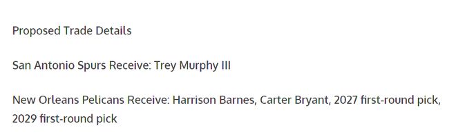 为了最大化状元秀文班亚马的威胁,马刺正积极追求特雷·墨菲三世。潜在交易方案为:马刺送出哈里森·巴恩斯、卡特·布莱恩特以及2027年、2029年首轮选秀权,从鹈鹕得到特雷·墨菲三世。
