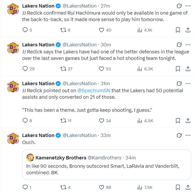 湖人12分惨败西部倒数第二的国王,这场比赛卢卡-东契奇42+8+7+4抢断沦为空砍,而且湖人开场一度领先9分,随着两队走马换将湖人的防守开始崩盘,最终在第二节被蒙克单节命中5个三分碾碎,下半场一直都在追分,好不容易缩小到7-8分又因为防守拉胯被拉开到12分左右。