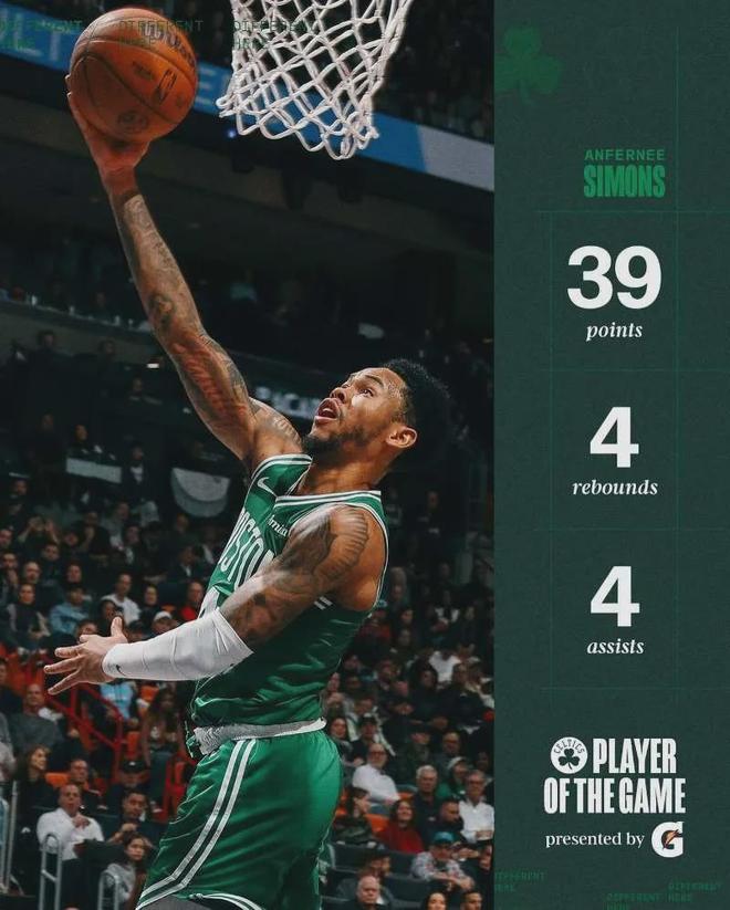 除此之外,新援安芬尼-西蒙斯的表现也能大吹特吹,势头直奔最佳第六人奖项,本赛季至今出战40场全部替补,场均上阵24.3分钟,贡献14.1分2.4板2.6助,场均以40.5%命中率扔进2.7记三分球,当今凯尔特人最重要的第二阵容火力输出点。