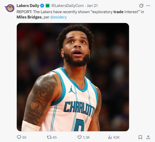 1月21日,埃文-斯迪瑞又报道,湖人与黄蜂已经就迈尔斯-布里奇斯进行过试探性的对话。实际上在小桥1月16日拿到25分8篮板4助攻帮助黄蜂击败湖人后,他的竞技状态就暴跌。