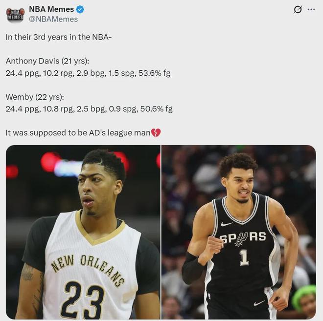 篮球媒体NBA Memes晒出一组数据对比,生涯第三年的浓眉和本赛季的文班亚马(同样第三年):浓眉场均24.4分10.2篮板1.5抢断2.9盖帽,投篮命中率53.6%;文班场均24.4分10.8篮板0.9抢断2.5盖帽,投篮命中率50.6%。