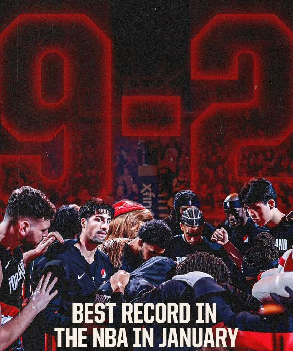 1月23日,开拓者127比110击败热火,球队豪取四连胜,同时他们在一月份取得9胜2负的联盟最佳战绩。
