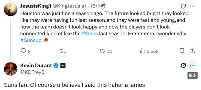 一个球迷转发虚假言论时写道:“说真的,在我看来,在交易来杜兰特之前, 火箭是更有竞争力的冠军争夺者。现在他们患上了‘杜兰特救世主情结’。”