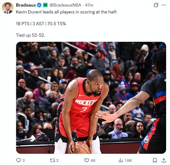 北京时间1月24日,火箭以111-104复仇活塞。这场比赛37岁的杜兰特又鏖战了41分钟,加上背靠背第一场打费城的44分钟,两场比赛老头子打了足足84分钟(不足24小时),但杜兰特的球场激情依旧在,他多次跟活塞替补席、看台球迷对喷,全场比赛拿到32+7+5三分上演死神降临。