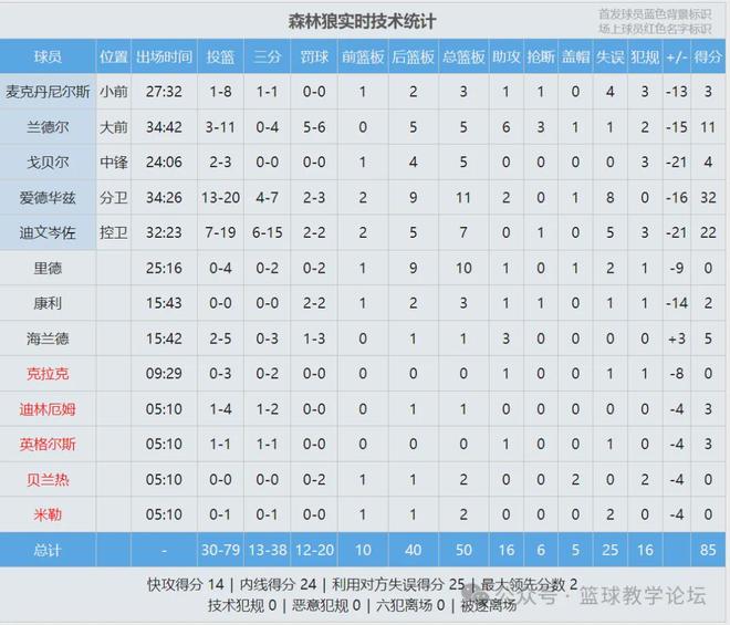 爱德华兹20投13中,三分7中4,罚球3中2,空砍32分11篮板2助攻1盖帽8失误,正负值-16。迪温琴佐高开低走,上半场9中6轰下17分,下半场10中1仅得5分。第四节早早进入垃圾时间,英格尔斯居然和波斯特还爆发了冲突。
