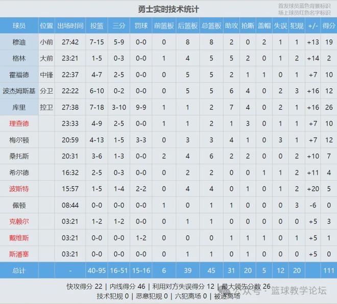 此役库里18投7中,三分10中3,罚球9中9,砍下26分2篮板7助攻4抢断,正负值+16。库里生涯总得分追平皮尔斯(26397)并列历史第19,再往前一位是邓肯(26496分)。上半场打完,勇士领先1分,第三节勇士38-17单节净胜21分。