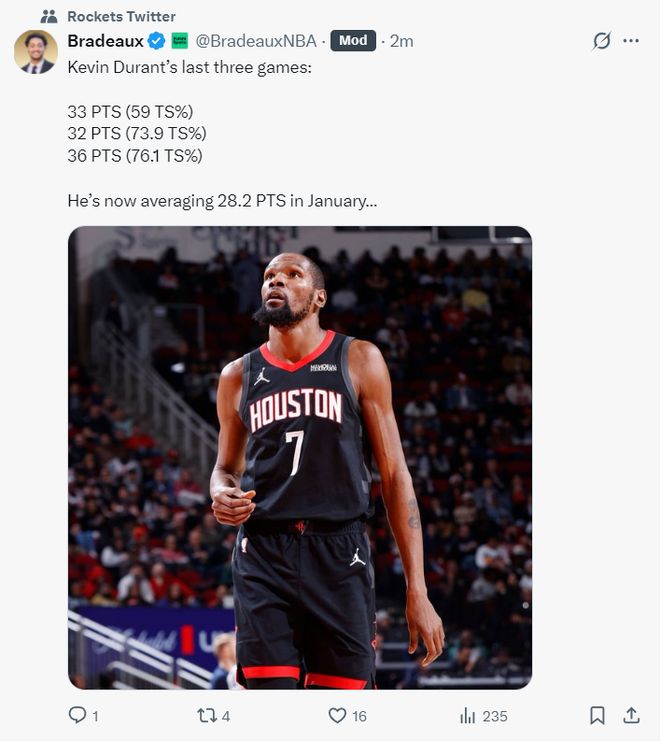连战122分钟轰101分!37岁杜兰特高呼热爱拼搏1月场均28.2分太强