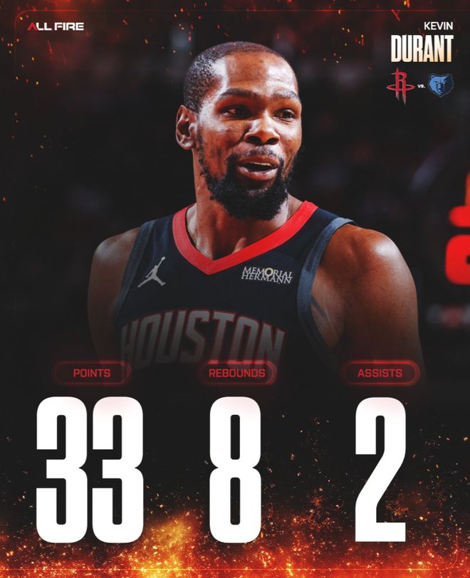 北京时间1月27日,火箭以108-99逆转灰熊。这场比赛乌度卡险些就要背锅了,好在杜兰特、申京两个核心在下半场接连的爆发,杜兰特第三节单节12分为球队缩小分差,末节开场是申京发力反超,杜兰特连续两个三分球直接锁定胜局。