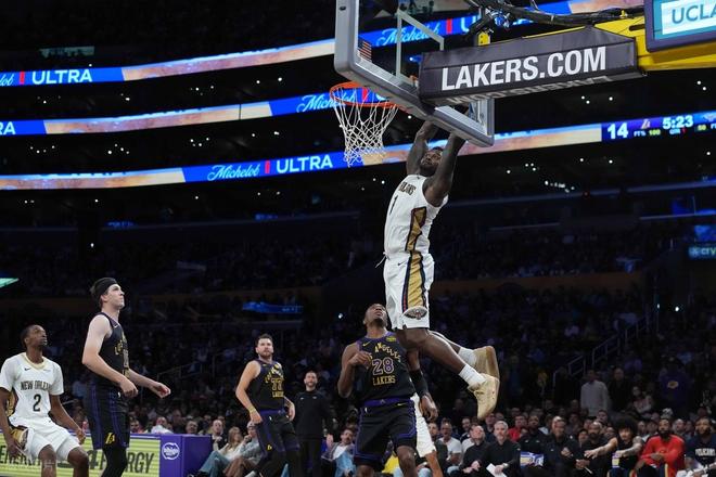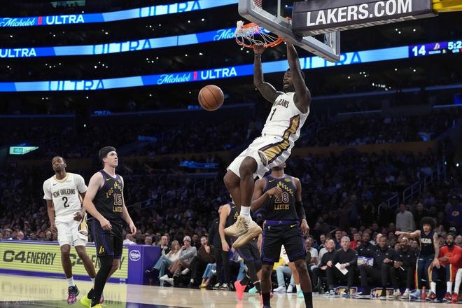 末节初端,湖人这边进攻不顺,被鹈鹕抓住机会一举领先到了8分,锡安反击上篮2+1打成,湖人暂停。暂停以后,湖人这边海斯先扣了,里夫斯进三分,老詹两罚不中以后,东契奇小抛投得分,湖人回敬一波12-0的小高潮。鹈鹕暂停,回到比赛,老詹空接,锡安篮下反篮止血,斯玛特关键三分命中领先到了7分,东契奇单挑墨菲三分还有杀死比赛。