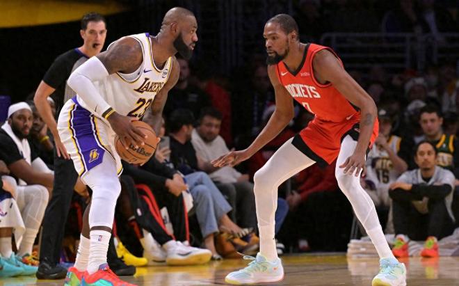 NBA常规赛,火箭坐镇主场迎战湖人。本场比赛的最大焦点,自然集中在詹姆斯和杜兰特两位超巨球员身上。
