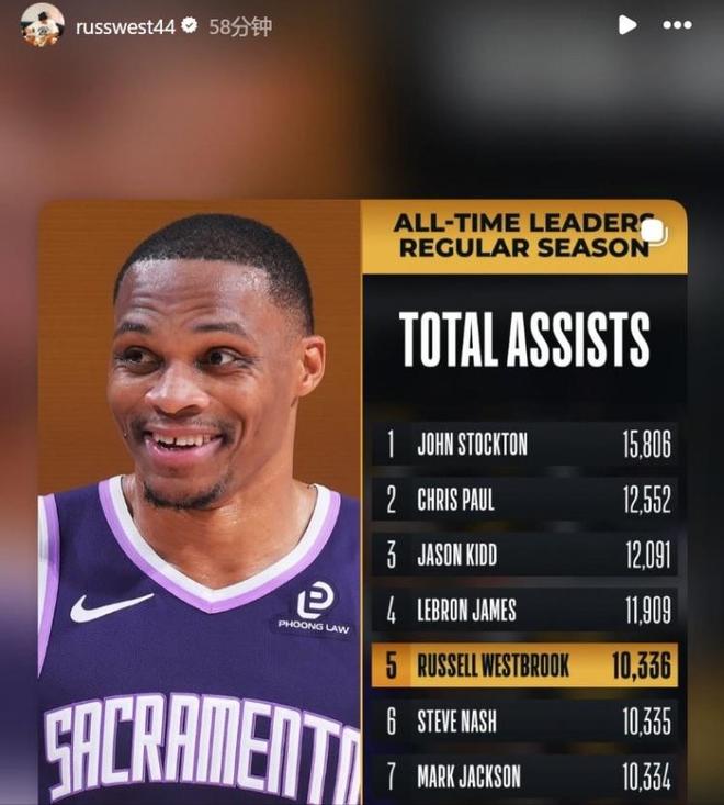 凭借这样的表现,威少生涯总助攻数成功超越马克-杰克逊和纳什升至NBA历史第五,赛后威少本人也转发多条动态庆祝。