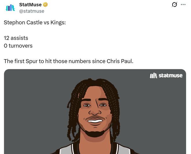 7名得分上双的球员中还不包括卡斯尔,本场他7中1失准,但狂送12次助攻并且一次失误都没有,凭借这样的表现,卡斯尔成为保罗之后马刺首位单场做到12助0失误的球员。