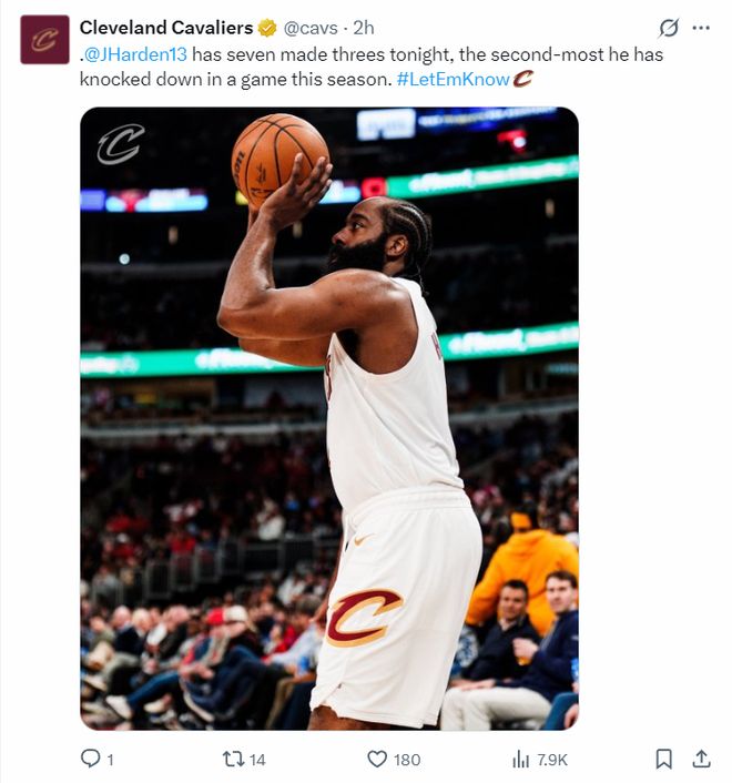 3.哈登此役单场命中7个三分球是赛季第二高,也是骑士生涯新高;