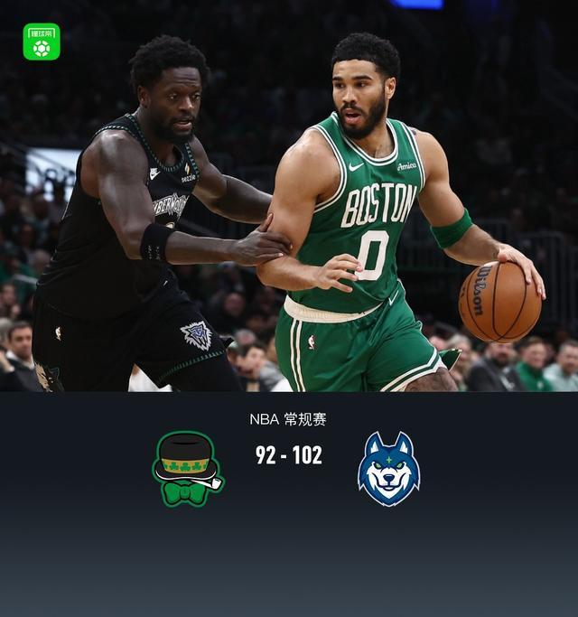 第四节凯尔特人德里克-怀特拿下4分,森林狼纳兹-里德拿下8分,最终凯尔特人92-102不敌森林狼