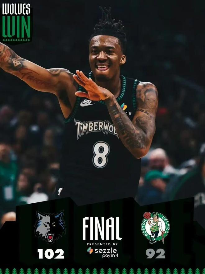 最终,森林狼爆冷以102-92逆转绿军