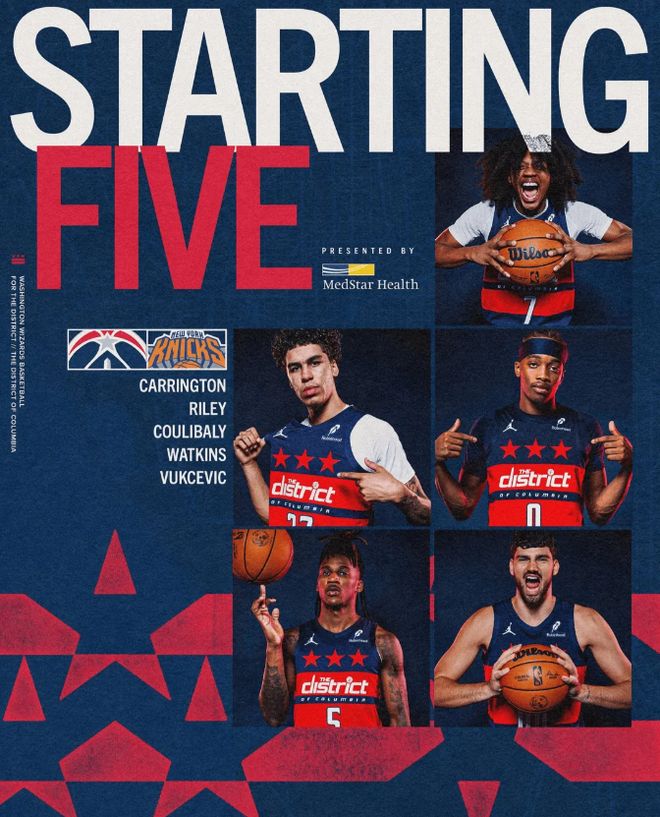 首发阵容方面,奇才队这边,特雷·杨(四头肌)、浓眉(手指)、拉塞尔(生病)、特雷·约翰逊(脚)、凯肖恩·乔治(肘部)、惠特摩尔(肩膀)等多达7名球员全部高挂免战牌,主帅排出的最新首发五人组为:卡林顿、莱利、库利巴利、沃特金斯、武克切维奇;尼克斯队这边,沙梅特与麦克布莱德缺席,首发阵容为:布伦森、布里奇斯、哈特、OG-阿奴诺比、唐斯。