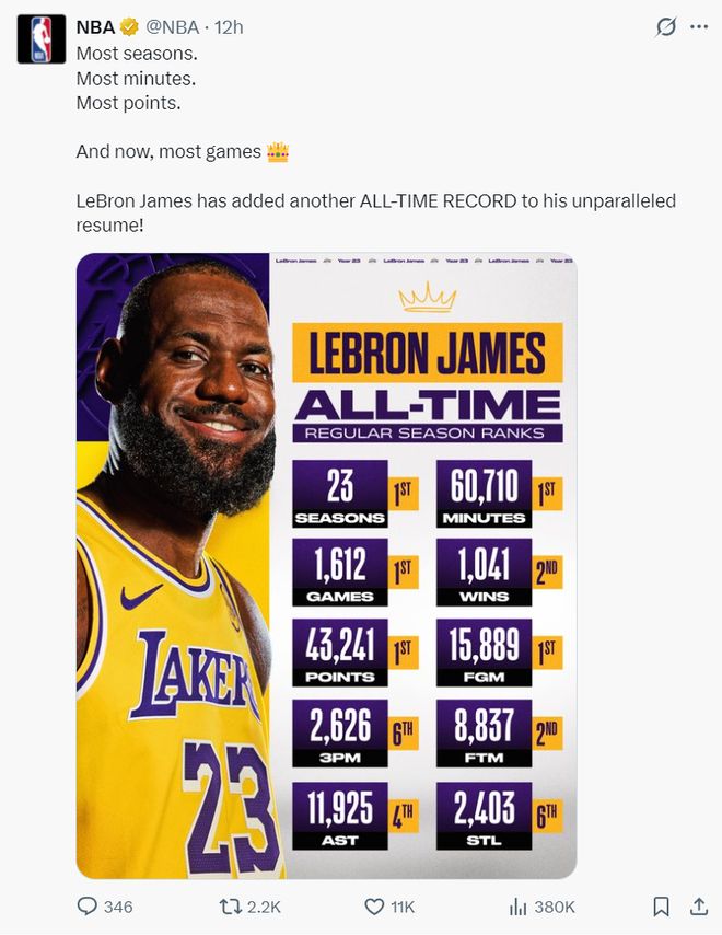 官方为41岁勒布朗戴上皇冠!又冲全新历史第1纪录湖媒转推赞GOAT