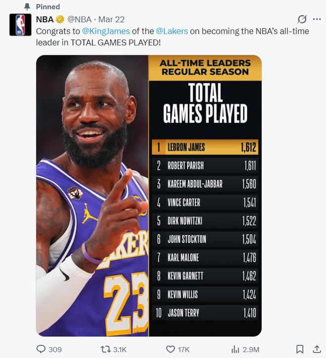 3月22日勒布朗完成1612场后NBA官方就将这项海报置顶了,历史前十登场数里只有勒布朗一人是现役球员。