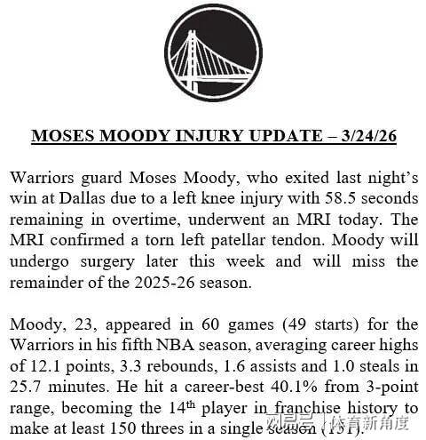 最坏的情况已然发生,虽在预料之中,但仍令人惋惜。据知名体育记者Shams披露,穆迪不幸遭遇左膝髌腱撕裂,将提前结束本赛季的所有赛程。另一位资深记者Siegel进一步补充称,预计穆迪还将缺席2026-2027赛季的大部分比赛。随后,勇士队官方发布声明,确认了这一消息的真实性。