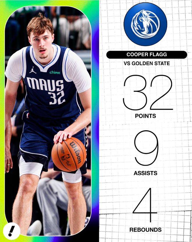 弗拉格在对阵勇士一战,41分钟,19中12,三分4中2,罚球6中6,拿到32分9助攻4篮板2抢断,命中率63.2%,三分命中率50%,罚球命中率100%,真实命中率73.9%。弗拉格新秀赛季已经拿到第八次30+。