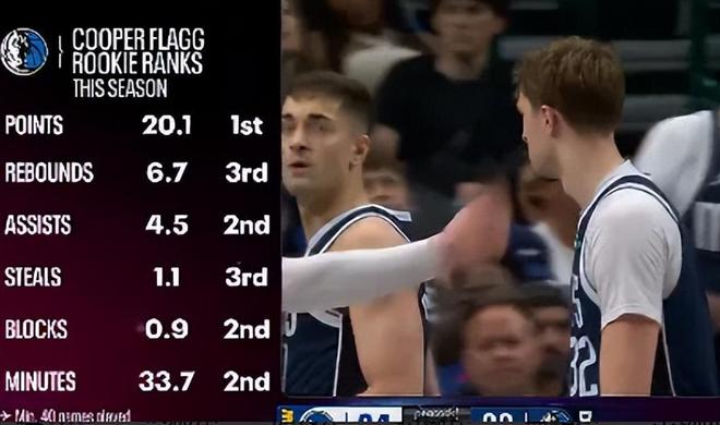 NBA官方出台数据,在新秀榜上弗拉格:得分第一、篮板第三、助攻第二、抢断第三、盖帽第二、出场时长第二多。(这6项数据都是新秀前三的存在)