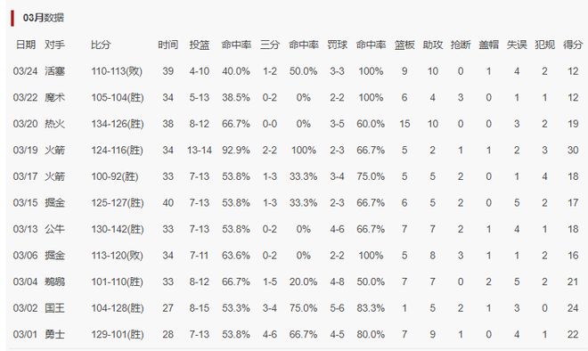 勒布朗-詹姆斯已经连续11场比赛出手不超过15次,只有在3月2日对阵国王的比赛中出手了15次 ,3月19日对阵火箭的比赛中出手14次,其余的比赛詹姆斯的出手都在13次及以下。