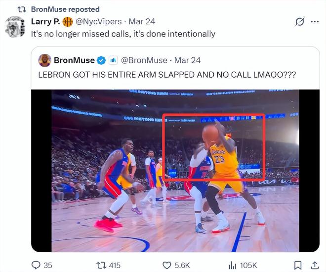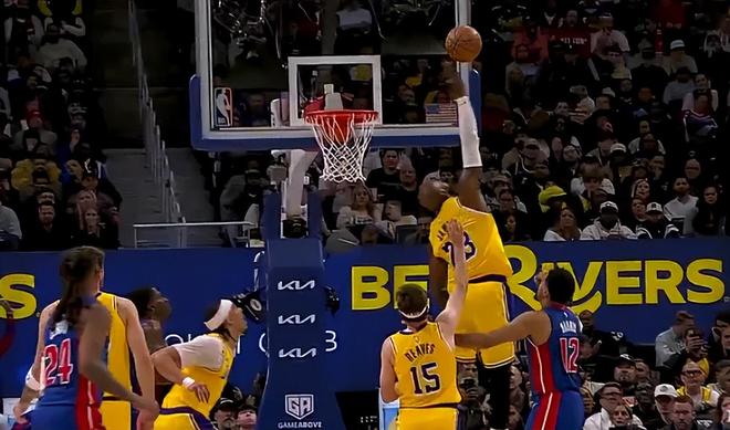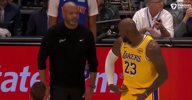 在对阵活塞的比赛中,詹姆斯只出手10次,外线投篮2次,其余八次都在三秒区内可他只获得3次罚球,而且这场比赛有两个争议判罚,第一节詹姆斯明显被打手但活塞挑战成功,第四节詹姆斯封盖后活塞则挑战成功是一个干扰球。41岁的勒布朗多次被裁判针对。