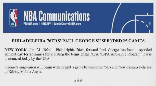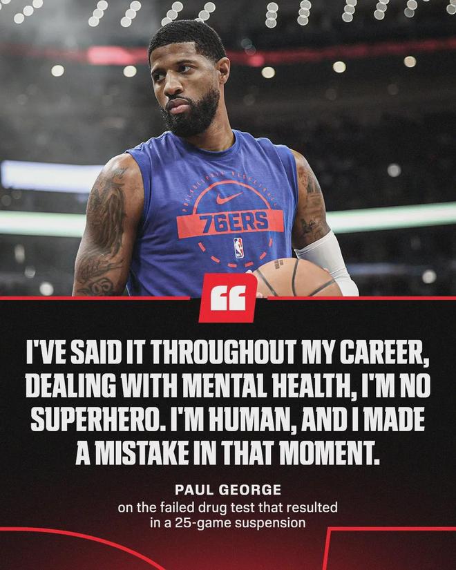 差不多两个月前,乔治被NBA官方禁赛25场,理由是他违反了NBA相关的禁药政策。