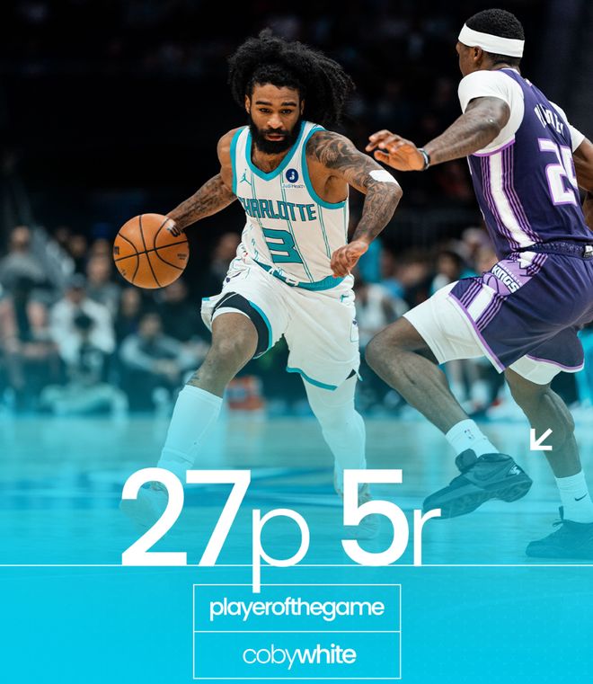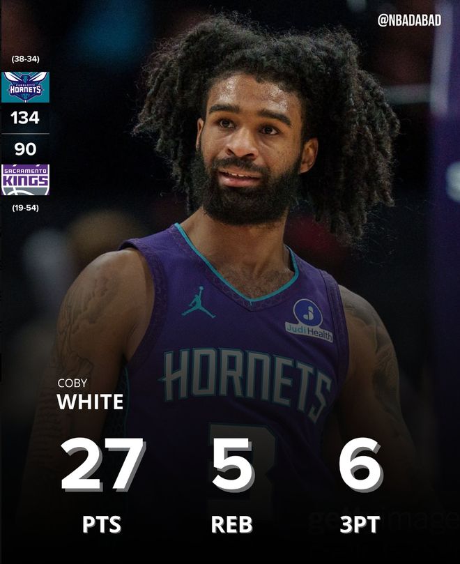 此役黄蜂全队5人上双+两人20+,拉梅洛-鲍尔16中7+三分13中6拿到20分8助攻6篮板2抢断;科比-怀特全场比赛18分钟,12中9,三分8中6,罚球3中3,拿到27分5篮板1助攻0失误,命中率75%,三分命中率75%,真实命中率101.4%,正负值+26。