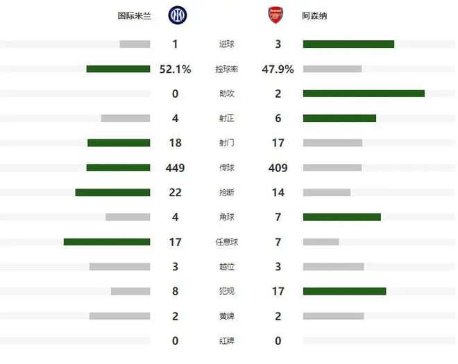 比赛数据显示,尽管国米在控球率上以51%对49%略占优势,但他们在传球成功率和进攻威胁上全面落后。高阶对比,阿森纳在关键数据上全面占优。尽管国米在射门次数上略占优势,但射正次数和预期进球数据明显落后,反映出他们在进攻效率上的不足。xOG预计破门数(1.33比2.12)清楚地反映出两队进攻效率的差距。