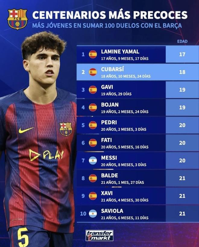 巴萨最年轻百场榜单出炉:亚马尔第1梅西才第7
