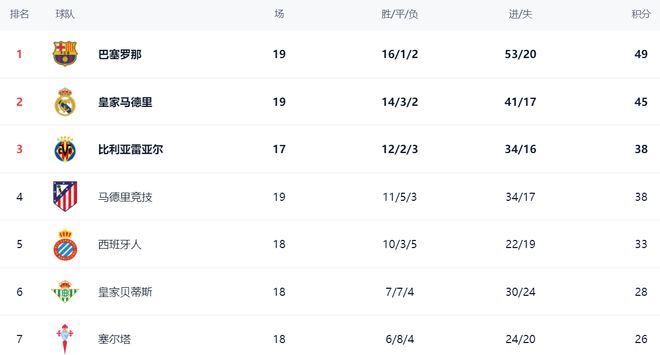 在积分榜上,巴萨依然高居榜首。巴萨的战绩是16胜1平2负,拿到了49分。而赢球的皇马紧随其后,战绩是14胜3平2负,拿到45分,以4分的劣势排名第2。比利亚雷亚尔拿到38分,排名第3。战平的马竞也是38分,排名第4。不过,马竞比比利亚雷亚尔多踢了2场比赛。西班牙人本赛季成绩非常出色,拿到33分,排名第5。皇家贝蒂斯以28分排名第6。