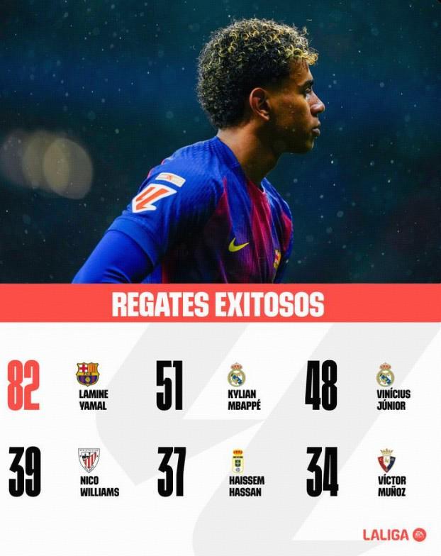 西甲官方晒本赛季成功过人榜:亚马尔高居榜首,姆巴佩次席