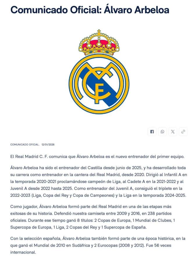 北京时间1月13日凌晨,皇家马德里俱乐部官方宣布,与主帅阿隆索协商一致,他将结束在皇马的执教,同时宣布B队主帅、球队名宿阿韦罗亚将出任球队临时主帅。