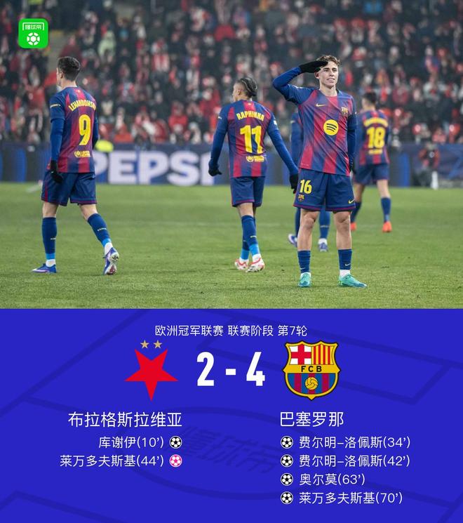 北京时间1月22日欧洲冠军联赛联赛阶段第7轮,布拉格斯拉维亚对阵巴塞罗那。上半场库谢伊幸运破门,费尔明梅开二度,莱万解围自摆乌龙,下半场奥尔莫世界波远射破门,莱万禁区钩射锁定胜局。最终比分布拉格斯拉维亚 2-4 巴萨。