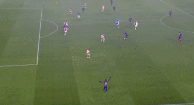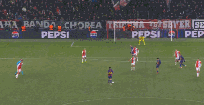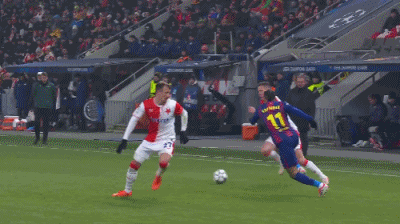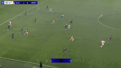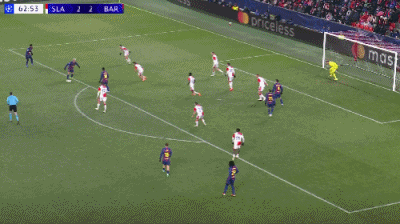 第34分钟,德容直塞,费尔明小角度抽射破门,巴萨1-1布拉格斯拉维亚
