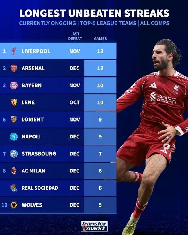- 百度搜索:德转丨五大联赛球队目前不败场次榜