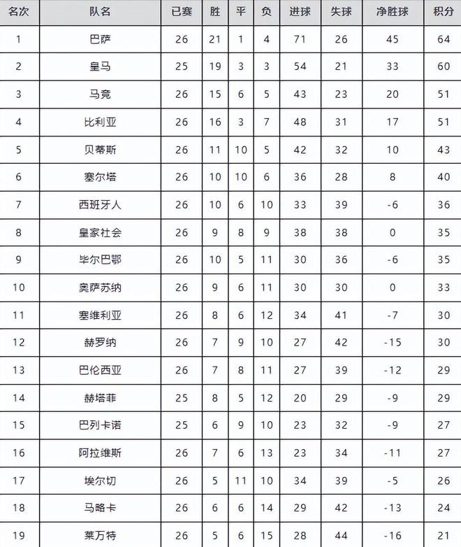 但接连两场关键战役失利,已令其丧失争冠主动权;马竞与比利亚雷亚尔同积51分,分列第三、第四位,距离榜首已有显著分差,基本退出冠军争夺,转而聚焦欧冠资格名额;