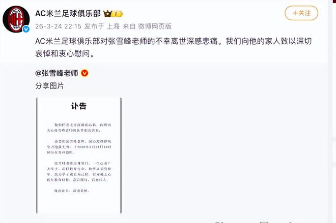 张雪峰讣告发布后,意大利AC米兰俱乐部官方社媒表示:“AC米兰足球俱乐部对张雪峰老师的不幸离世深感悲痛。我们向他的家人致以深切哀悼和衷心慰问。”