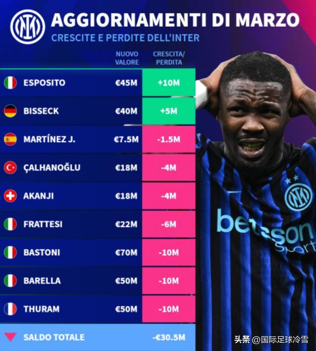 国米全队身价下滑3050万欧元为何暴跌速度超过米兰尤文之和