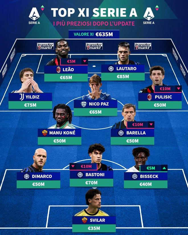 意甲最贵阵容:劳塔罗领衔国米5人入选,伊尔迪兹、莱奥在列