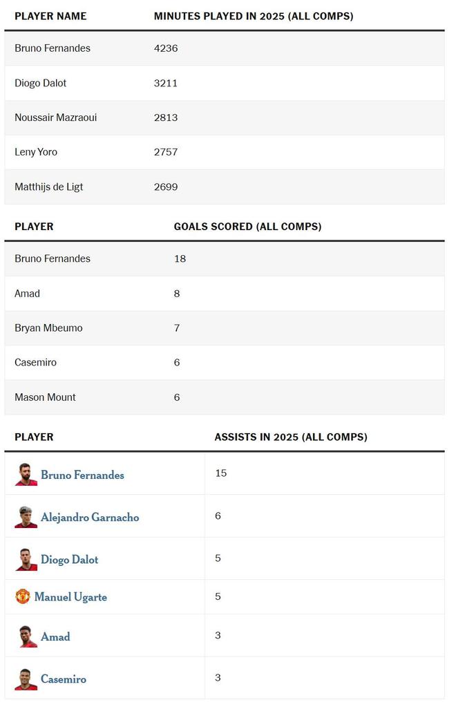 以下是曼联球员在1-0战胜纽卡斯尔联后的年度部分排名数据。
