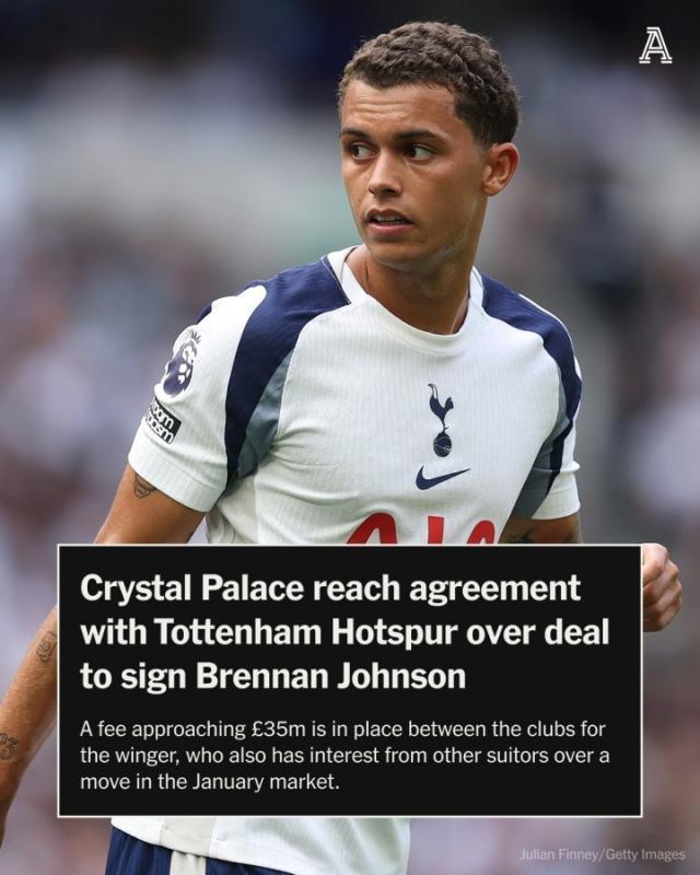 12月30报道 据The Athletic名记奥恩斯坦报道,水晶宫已经与热刺达成协议,以近3500万镑转会费签布伦南·约翰逊。球员仍需在交易最终确定前决定自己的未来,双方协商的转会费接近3500万镑(折合欧元约4000万欧)。目前,约翰逊也吸引了其他球队在一月转会窗的兴趣。2023年夏窗,布伦南·约翰逊以5500万欧转会费从诺丁汉森林加盟热刺,本赛季球员为热刺出战22场比赛,打进4球,德转身价3500万欧。