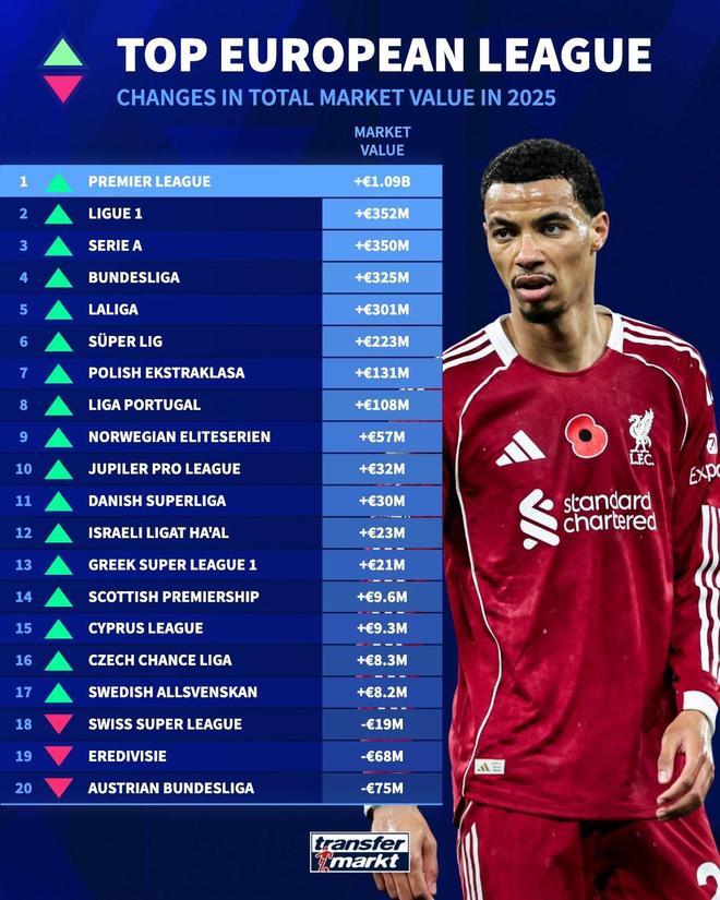 德国转会市场统计了2025年欧洲联赛身价涨跌榜,其中英超上涨10.9亿欧居首,法甲第二。