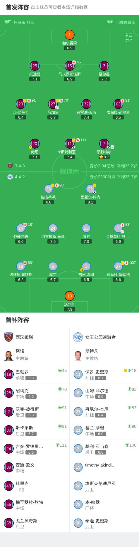 足总杯西汉姆联21QPR晋级,卡斯特利亚诺斯加时制胜