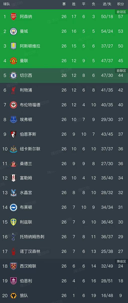 北京时间2月13日,随着阿森纳客场1-1和布伦特福特的比赛结束,英超第26轮的最新排名出炉!枪手领先优势缩水,以57分继续领跑,但只领先身后的曼城4分,阿斯顿维拉以50分暂列第3名,曼联力压切尔西,以45分守住第4名。
