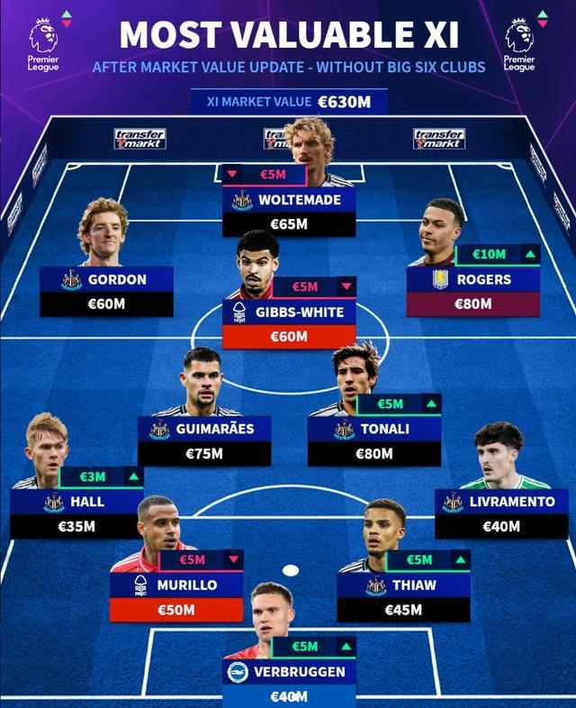托纳利(纽卡斯尔联)8000万欧元(+500万欧元)、吉马良斯(纽卡斯尔联)7500万欧元、吉布斯-怀特(诺丁汉森林)6000万欧元(-500万欧元)