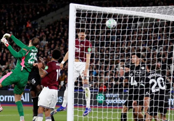狂攻不止的曼城,在第85分钟差一点完成绝杀,赖因德斯左路主罚的任意球,直奔球门死角而去,可惜运气不佳,皮球击中门框被弹出,最终曼城只能接受和铁锤帮打平的结局,只从伦敦带走了一个积分。