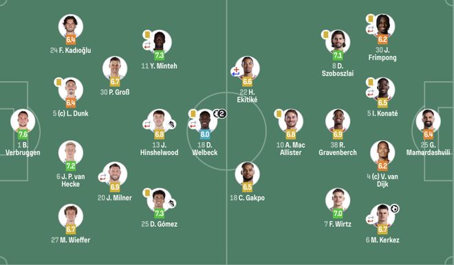 布莱顿(4231):1-维尔布鲁根;27-魏费尔,6-范赫克,5-邓克,24-卡迪奥卢;20-米尔纳(76’17-巴莱巴),30-格罗斯;25-戈麦斯,13-辛谢尔伍德(83’26-阿亚里),11-明特(76’22-三笘薫);18-维尔贝克(83’10-鲁特尔)