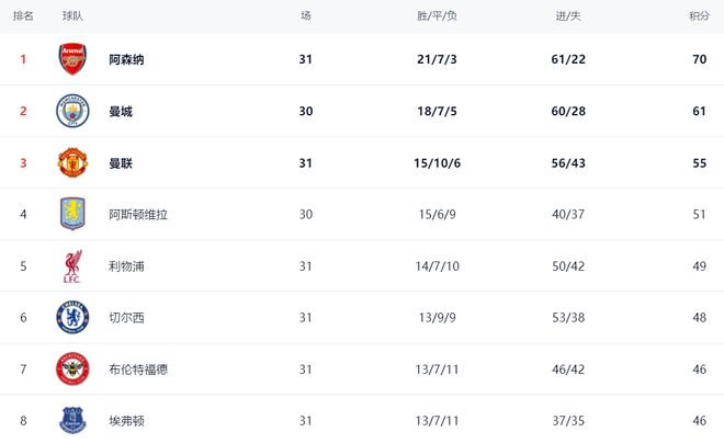 在积分榜上,阿森纳独领风骚,以70分高居榜首。曼城排名第2,只拿到61分,落后9分,争冠希望基本破灭。曼联排名第3,拿到55分。第4的是阿斯顿维拉,拿到51分。利物浦输球,依然是49分,排名第5。切尔西则是48分,排名第6。布伦特福德46分,排名第7。埃弗顿赢球之后,总积分达到46分,排名第8,仅仅落后切尔西2分。